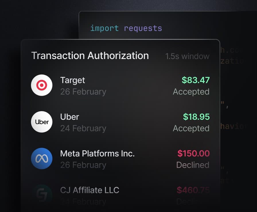 Approve or decline card transactions in real-time with custom business logic.