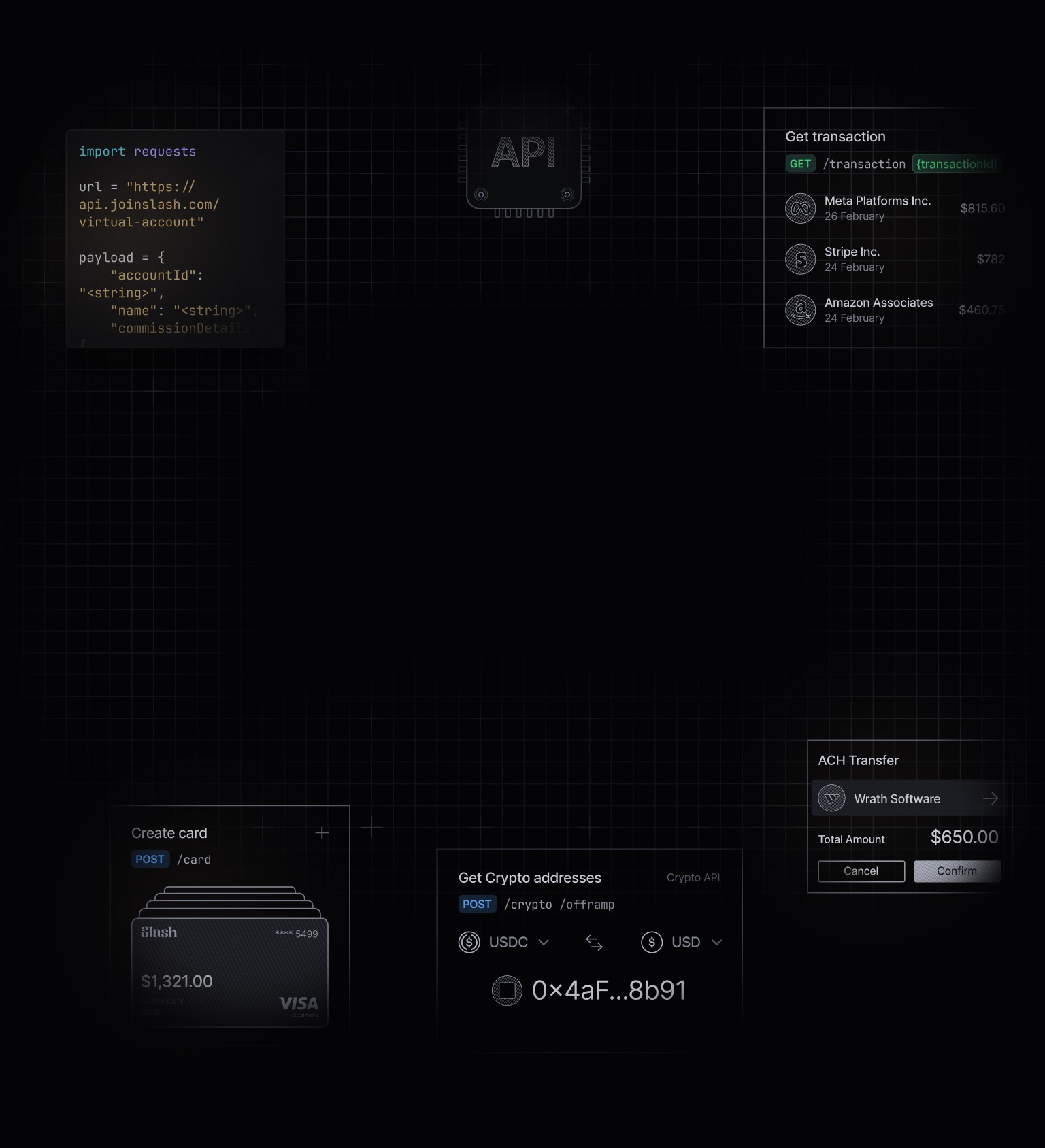 Integrate Slash into your stack in minutes. Automate transfers, reconcile payouts, and access real-time financial data with a single API.