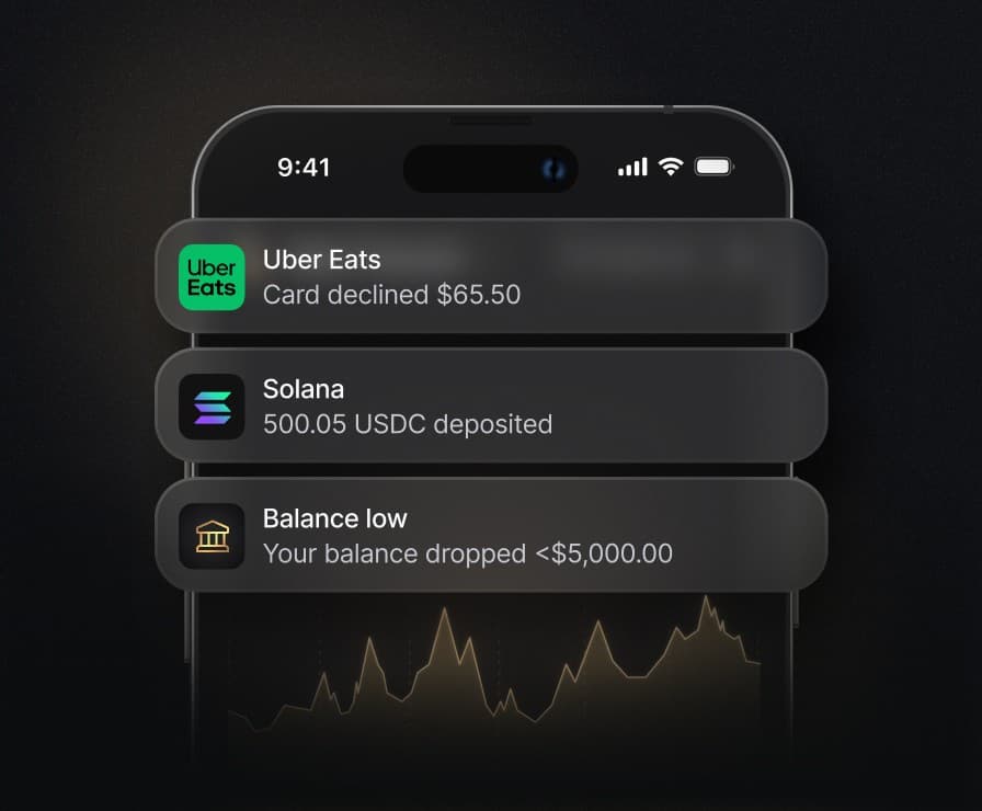 Receive banking notifications to custom webhooks for transaction declines, limit updates, ACH authorizations, and more.