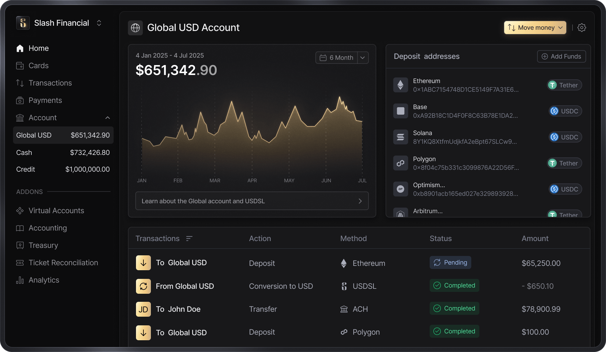 Track balances across cash, credit, and Global USD. Instantly reconcile deposits, wires, and crypto transfers — all from a single dashboard.